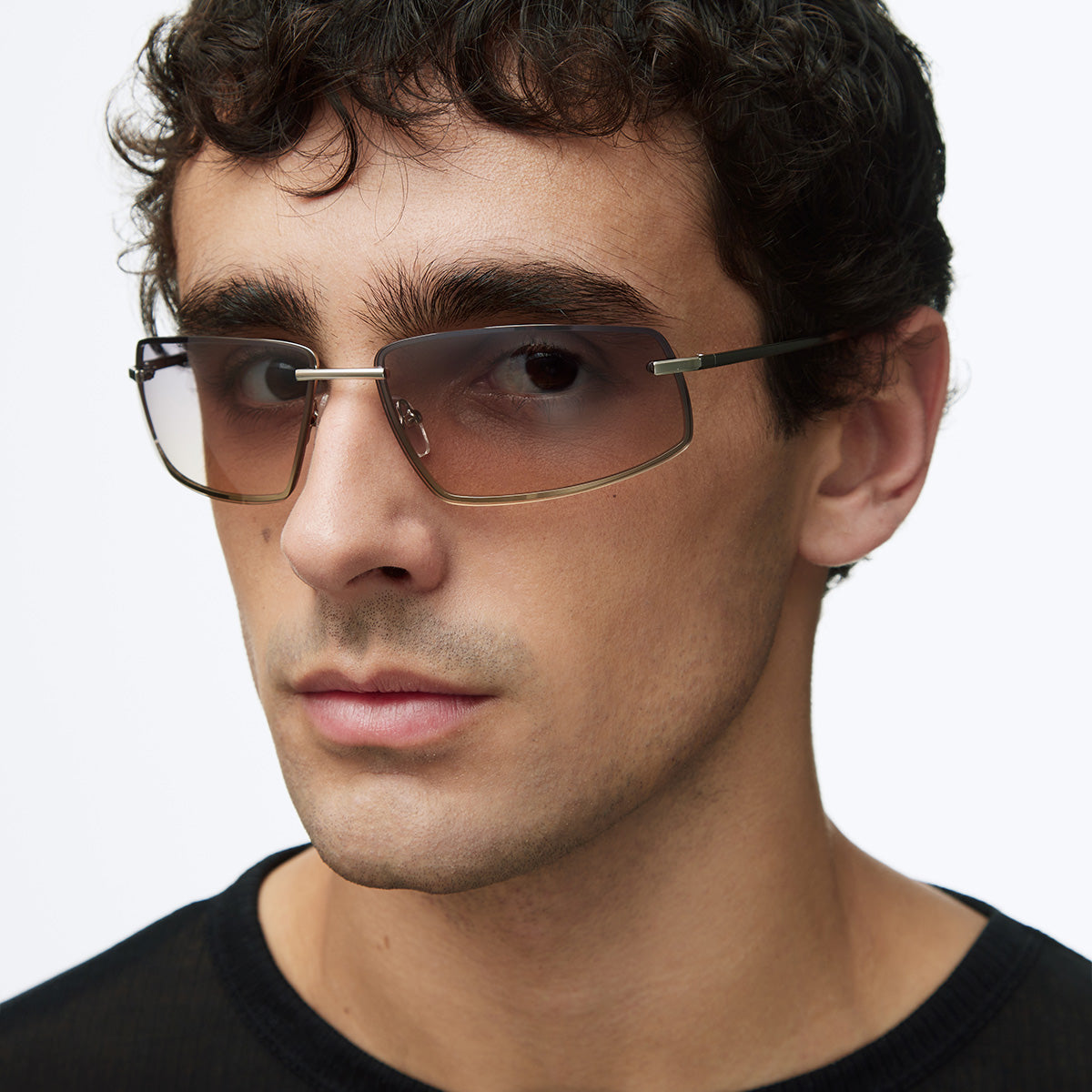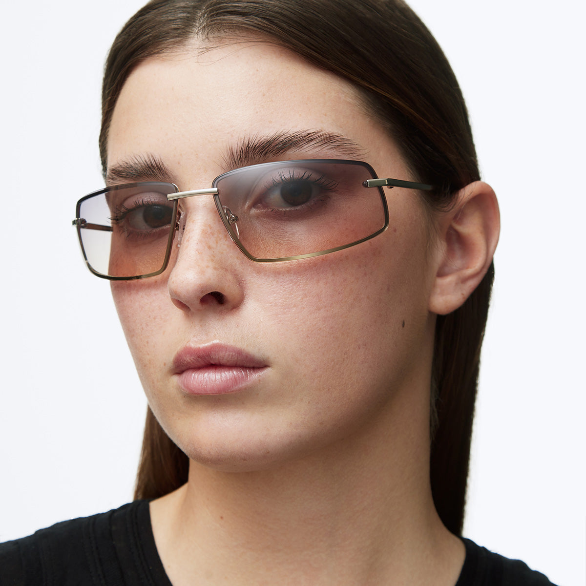 Les lunettes Baraka possèdent une silhouette rectangulaire enveloppante, avec une monture et des branches métalliques, ainsi que des verres fumés disponibles en trois couleurs différentes. Un voyage direct jusqu'aux années 2000 : regard bas et attitude de pop star.